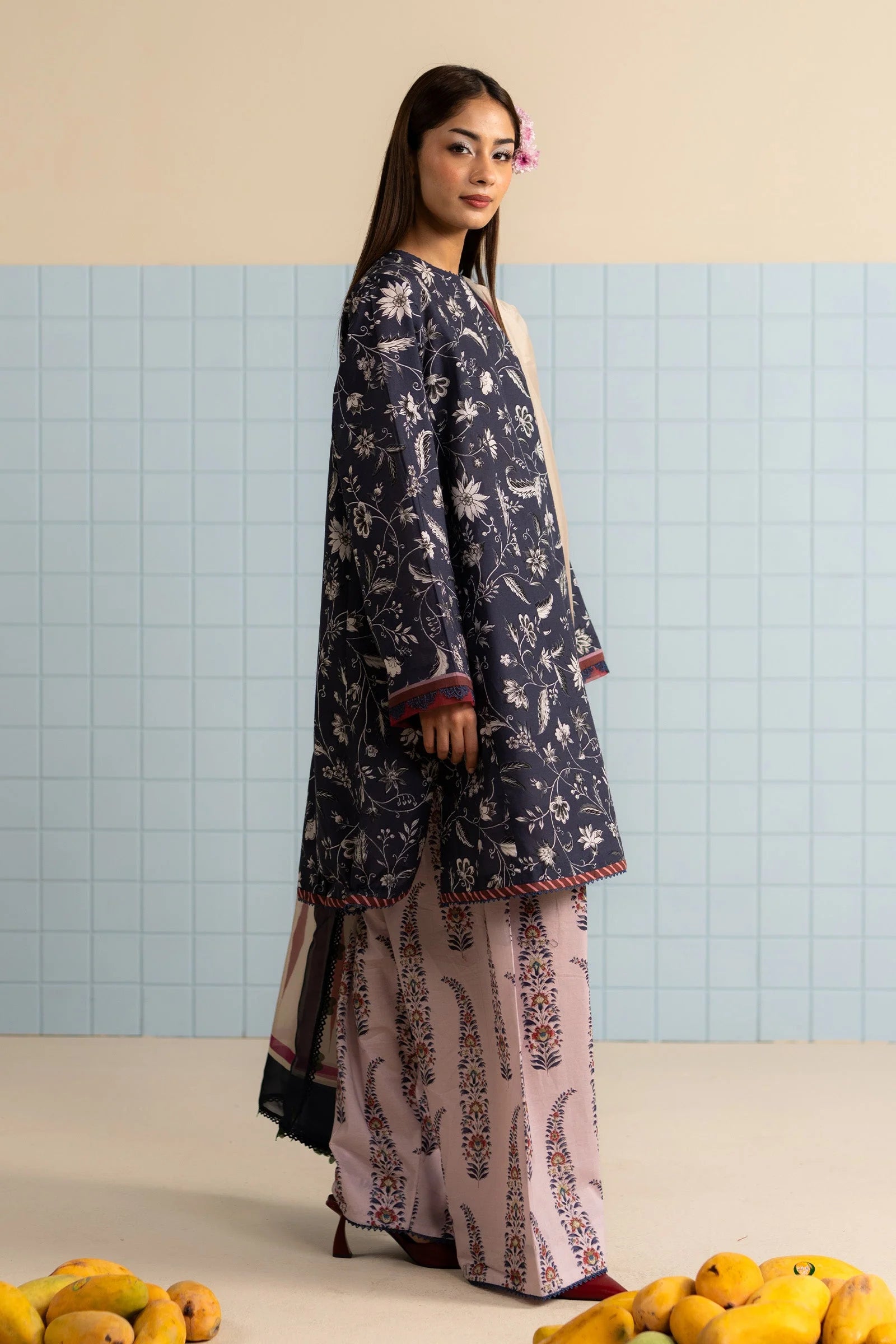 A blue shirt paired with lavender trousers and a soft silk dupatta—fresh hues in an effortlessly graceful silhouette.